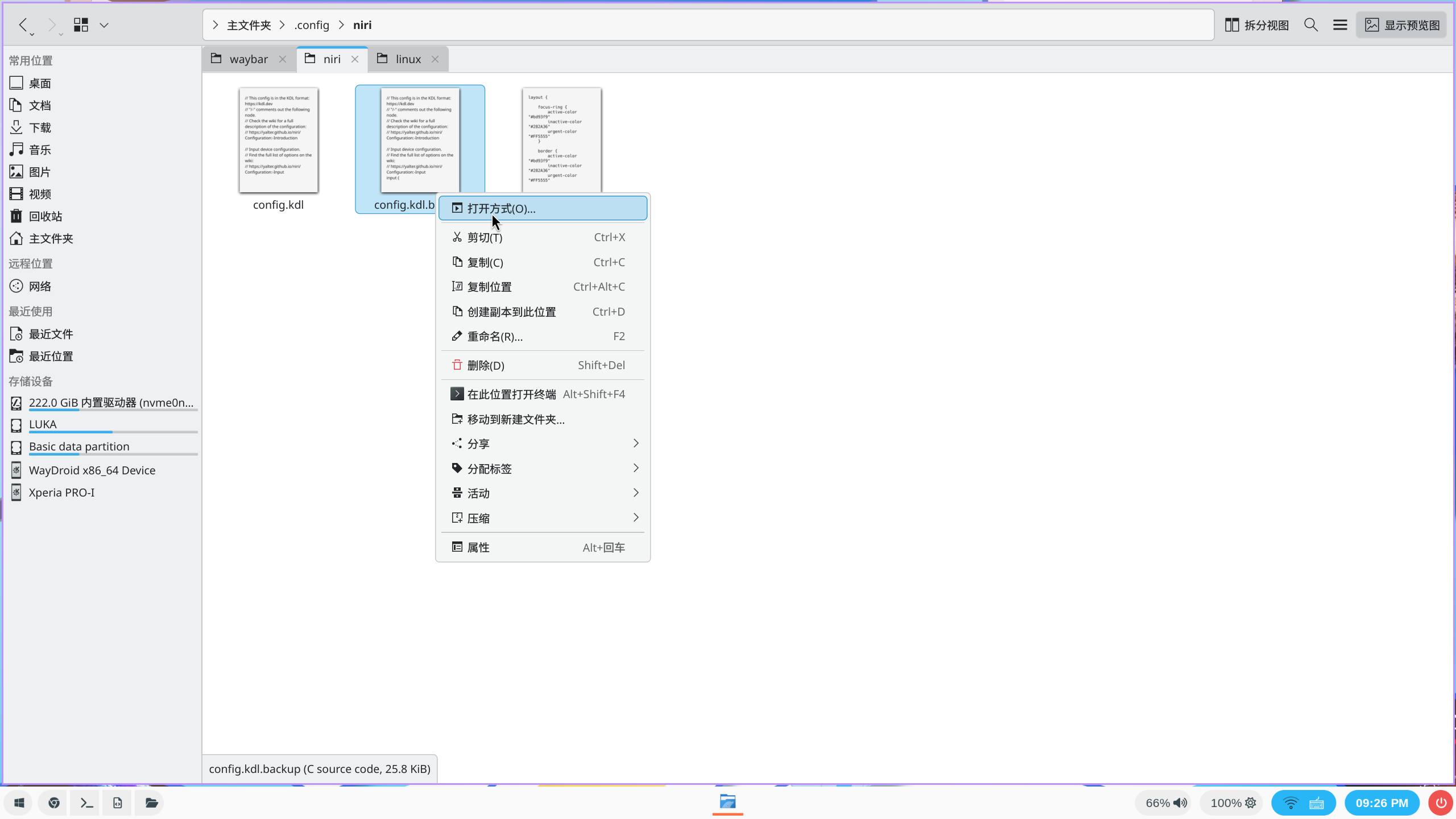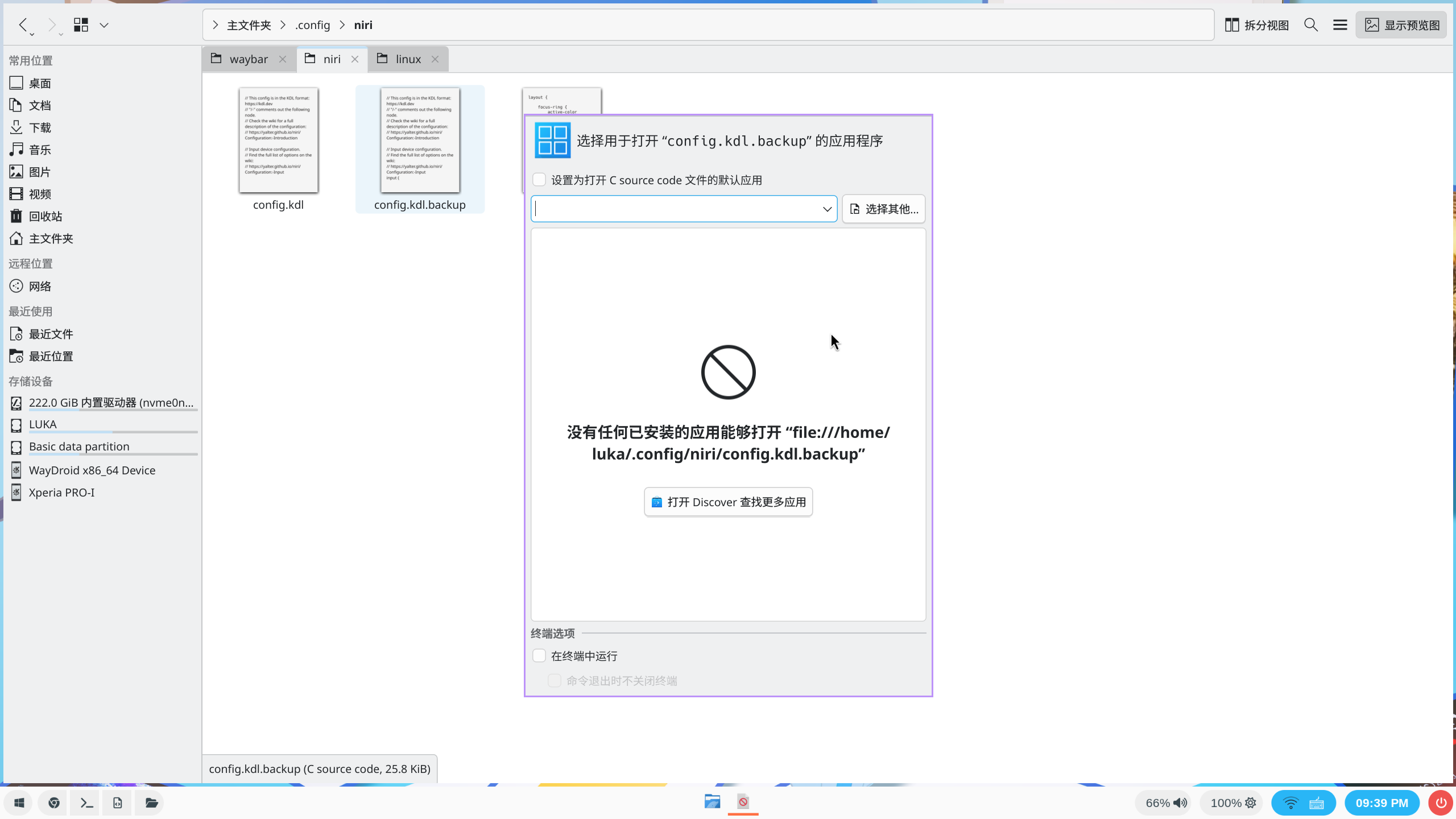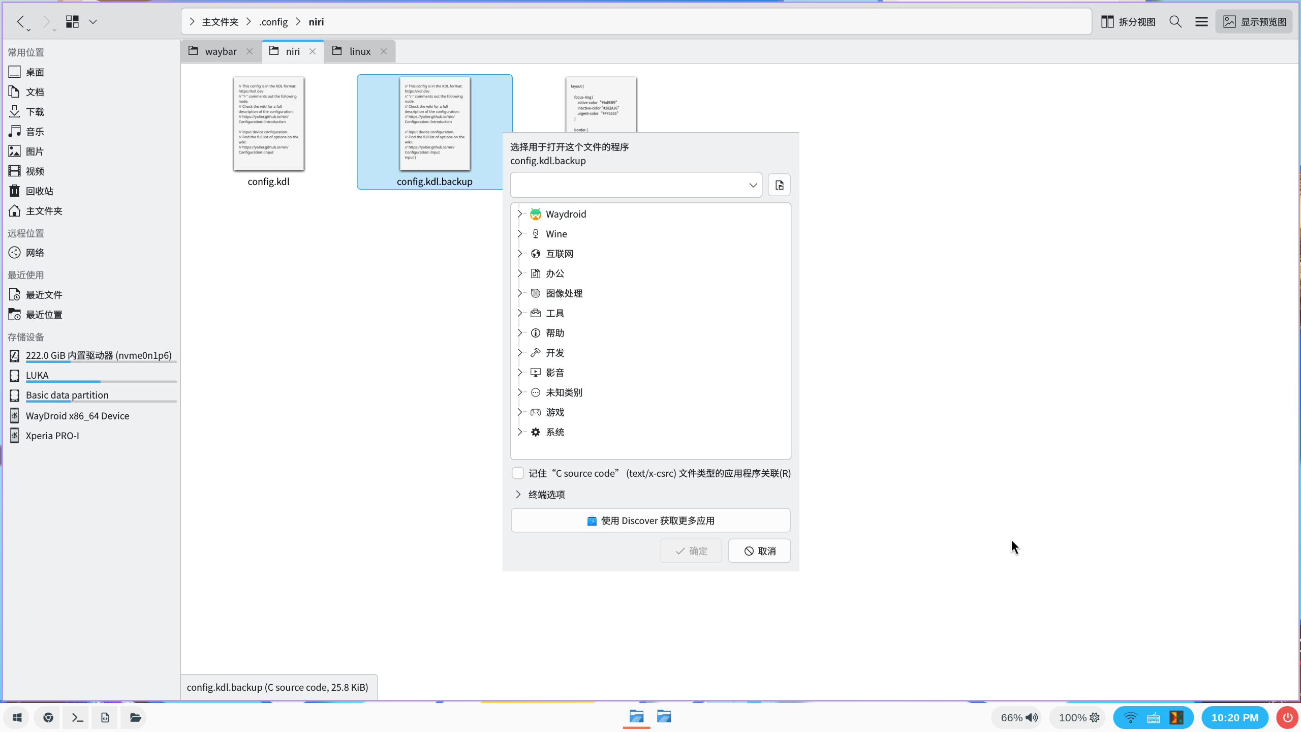 在Niri中使用Dolphin时,可能会遇到“打开文件无法弹出软件选择窗口”的情况。经测试,在终端手动运行 xdg-desktop-portal-kde 之后,这个问题就解决了。