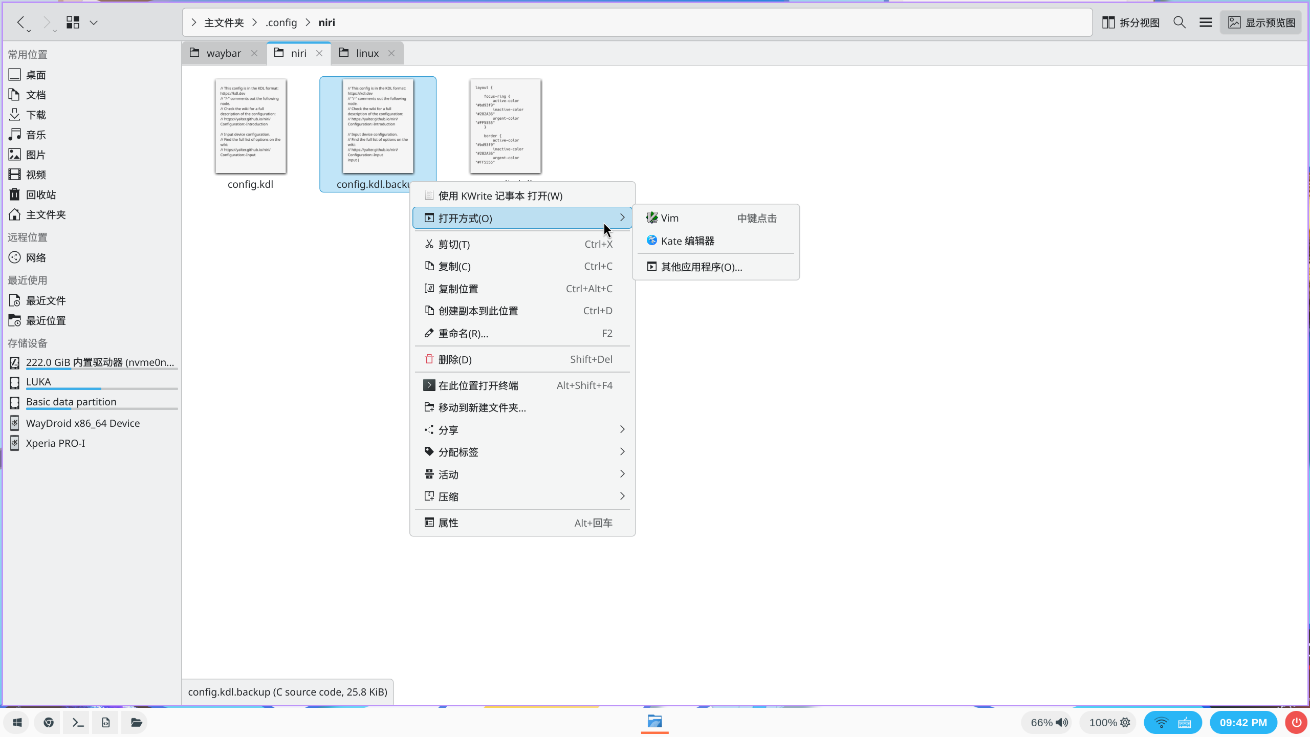 我一直采用KDE与Niri共存的模式,为了不安装多余的软件,因此需要复用许多的KDE生态组件。Dolphin作为KDE的文件管理器,非常好用。