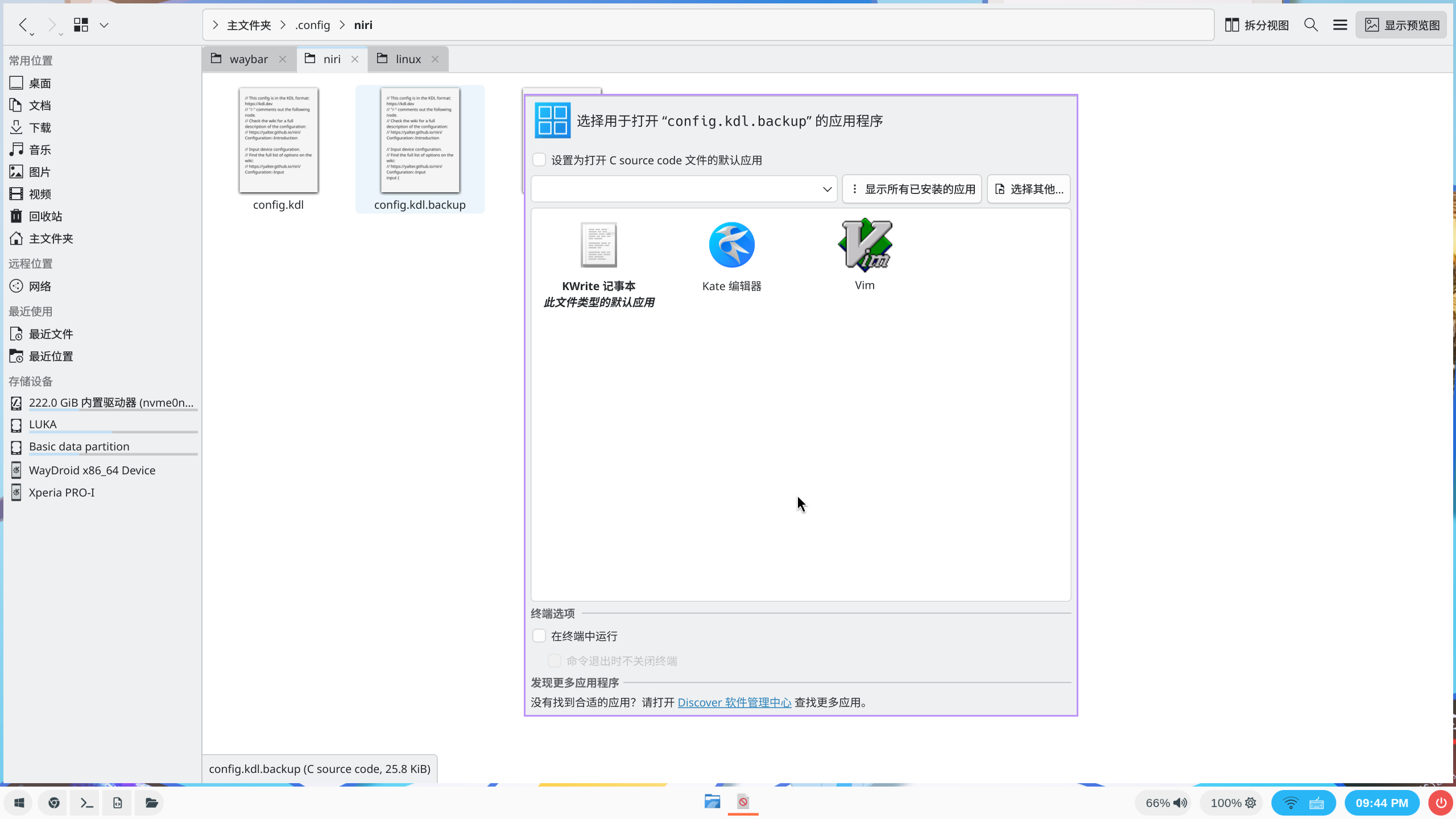 在Niri中适配Dolphin后,确保无论通过何种方式打开文件夹或文件选择器,都默认使用Dolphin,在niri上Dolphin会出现许多问题,目前所发现的几个问题: